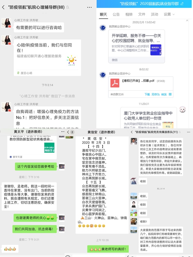 学院学工组建立就业指导、心理辅导交流群,组织学院职业指导师、心理辅导员开展线上精准就业帮扶与心理疏导。借助学院就业促进中心、心晴工作室、“厦日心晴”等微信平台,进行线上就业咨询、心理应对技能宣传,帮助学生正视疫情影响、积极调节情绪,缓解疫情所致的求职困难与心理困扰。离退休教师党员黄信安创作《武汉加油˙中国加油》系列诗歌15篇,为防疫抗疫贡献精神力量。