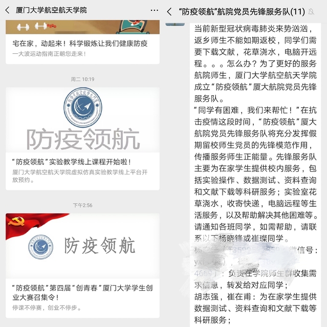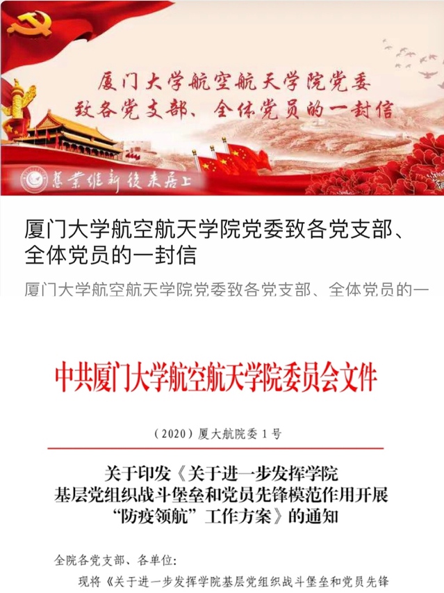 “疫情就是命令,防控就是责任”。习近平总书记作出重要指示,强调要把人民群众生命安全和身体健康放在第一位,把疫情防控作为当前最重要的工作来抓。厦门大学航空航天学院党委认真落实教育部党组、中共福建省委、中共厦门市委、厦门大学党委有关要求,充分发挥基层党组织战斗堡垒和党员先锋模范作用,为打赢疫情防控阻击战提供坚强政治保证。学院党委发布致各党支部、全体党员的一封信,精心设计、发文实施“防疫领航”系列工作,全面落实联防联控措施,构筑起群防群治的严密防线,让党旗在防控疫情斗争的第一线高高飘扬。
