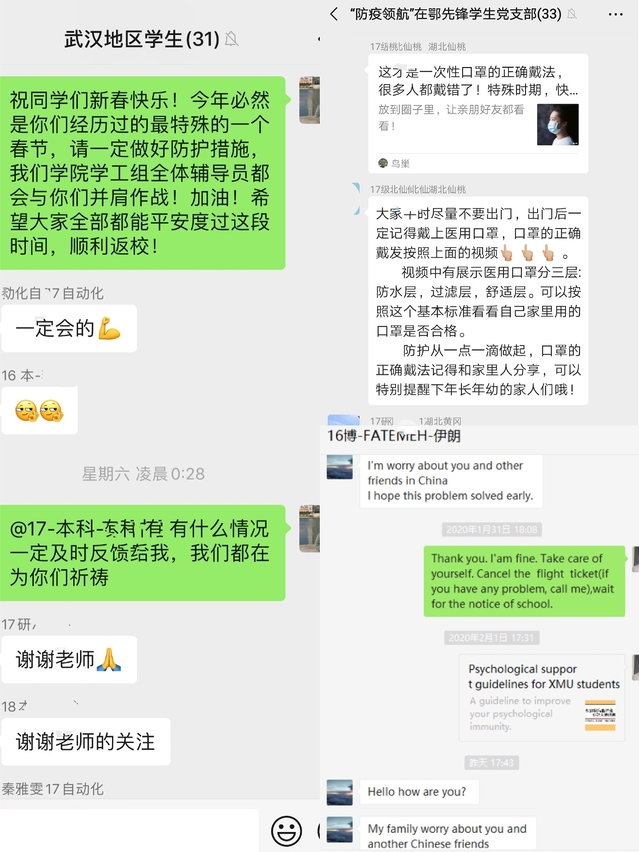 学院党委及时了解湖北特别是武汉地区师生信息,第一时间送上关心关怀。组建在鄂先锋学生党支部,分别成立党小组实时掌握疫区学生健康动态信息,构建“网格化”信息管理体系。建立师生健康监测体系,针对重点人员定期摸底排查,准确掌握行程和动态,每日报送每位师生的健康监测情况;研究生导师、辅导员共同要求离校学生不得提前返校。学院学工组还积极关注国际生情况,提醒相关注意事项,2016级伊朗籍博士生FATEMEH KARIMIDEHCHESHMEH给中国师生回复了诚挚的视频祝福。