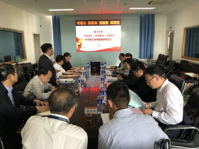 11月13日上午,中央第三指导组组长诸葛彩华、成员宋翔一行莅临医学院调研“不忘初心、牢记使命”主题教育开展情况。校党委副书记、副校长李建发,校党委常委、组织部部长、统战部部长孙理,校长助理、翔安校区党工委书记、管委会主任陈光陪同调研。
