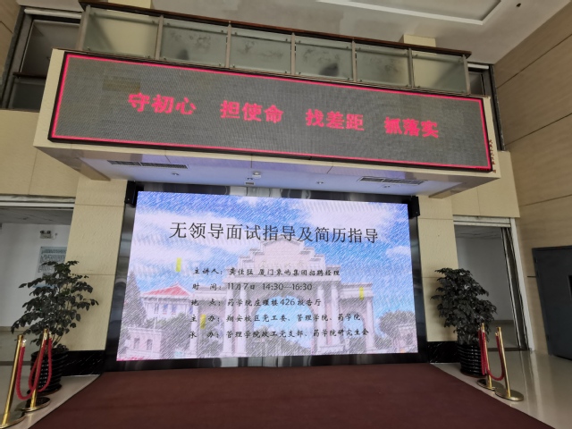 11月7日,由厦门象屿集团招聘经理、厦门大学2015届校友龚佳猛担任主讲嘉宾的“无领导面试及简历指导”讲座如期而至,来自药学院、公共卫生学院、医学院、环境与生态学院的90余名应届毕业生,齐聚药学院庄瑾楼426报告厅,认真聆听专业指导。讲座由药学院党委副书记杜超主持。
