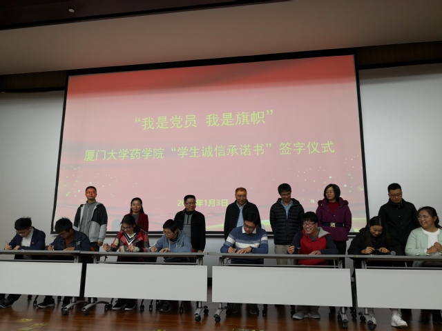 为了增强药学院学生诚信意识,养成高尚情操,会议现场举行了药学院学生诚信承诺书签字仪式。药学院500余名在校学生在2017级本科生索紫矝同学带领下,集体宣读了学生诚信承诺书内容。随后,8位学生党员代表、团员代表和学生干部代表走上前台,在院领导及本科生班主任老师的共同见证下,在承诺书上庄严签字。其余学生也各自座位上完成了签字仪式。