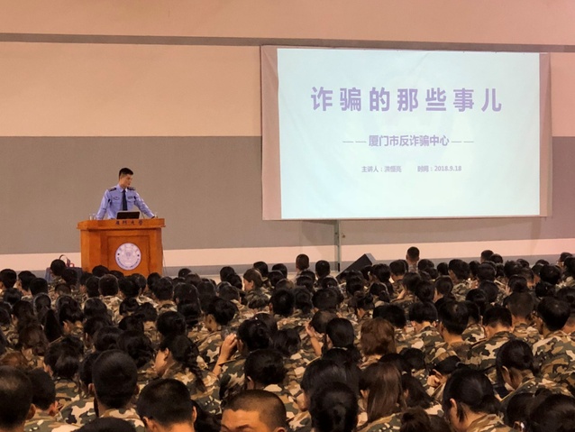 9月18日晚,翔安校区邀请学生军训团副团长刘红涛和厦门市反诈骗中心民警洪恒亮警官在校区综合体育馆为1900名2018级新生带来了国防教育暨防诈骗讲座。讲座由翔安学生办主任张清榕主持。