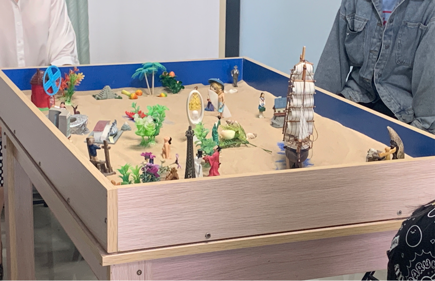 活动过程中,同学们进行团体沙盘的创作,依次做出指定动作。沙盘从一开始的孤单雕塑,到最后集古今、自然、文明乃至神秘感为一体的集合地,逐渐分化出相对完整的社会体系。