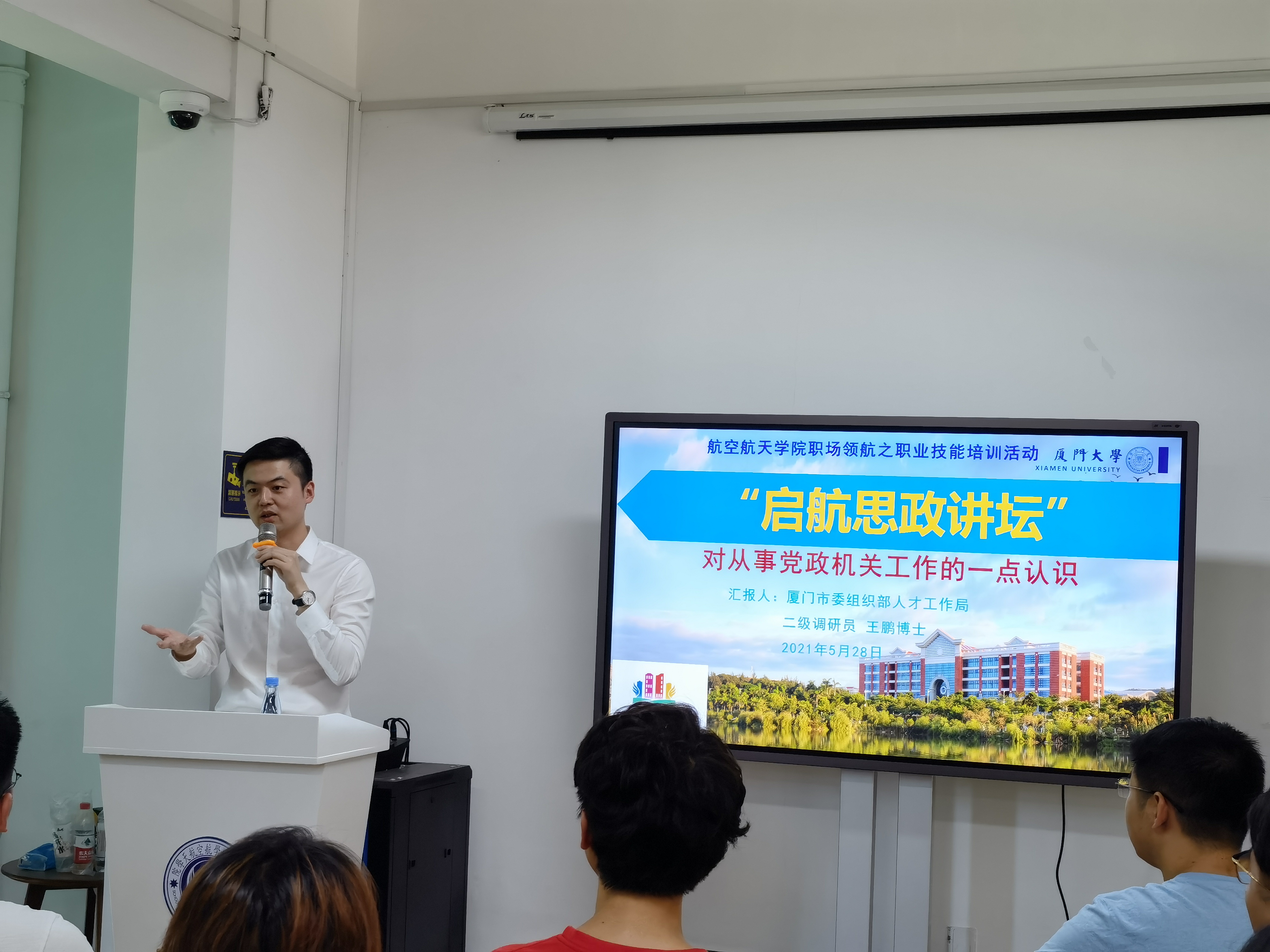 2021年5月28日,航空航天学院“名师导航”之基层就业培训会在翔安校区映雪五“一站式”社区创新创业工作坊举办。本次培训会为航空航天学院“启航思政讲坛”第6期活动,邀请了2008届自动化系院友、厦门市委组织部人才工作局二级调研员、厦门市高层次人才发展中心负责人王鹏为学院2021届即将进入党政机关基层就业的毕业生开展题为《对从事党政机关工作的一点认识》的讲座。翔安校区团工委书记兼校团委副书记林蕊,航空航天学院团委副书记倪建超,辅导员孟旭、刘群等参加活动。
