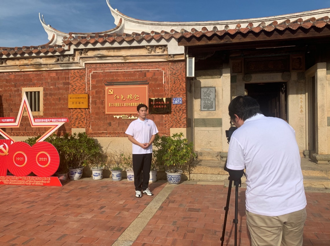 学党史,践初心,担使命。为厚植青年学子爱党、爱国、爱社会主义的情感,让红色基因、革命薪火代代传承,2021年暑假国际学院组建“自强”新青年党史宣讲实践队奔赴祖国各地,探寻红色记忆,宣讲党的故事、革命的故事、英雄的故事,录制制作宣讲视频,以新颖的方式,让党史学习教育更能入脑入心。7月9日,实践队泉州小分队队员在辅导员吴婧老师的带领下,前往福建晋江开展党史学习教育和宣讲视频拍摄活动。