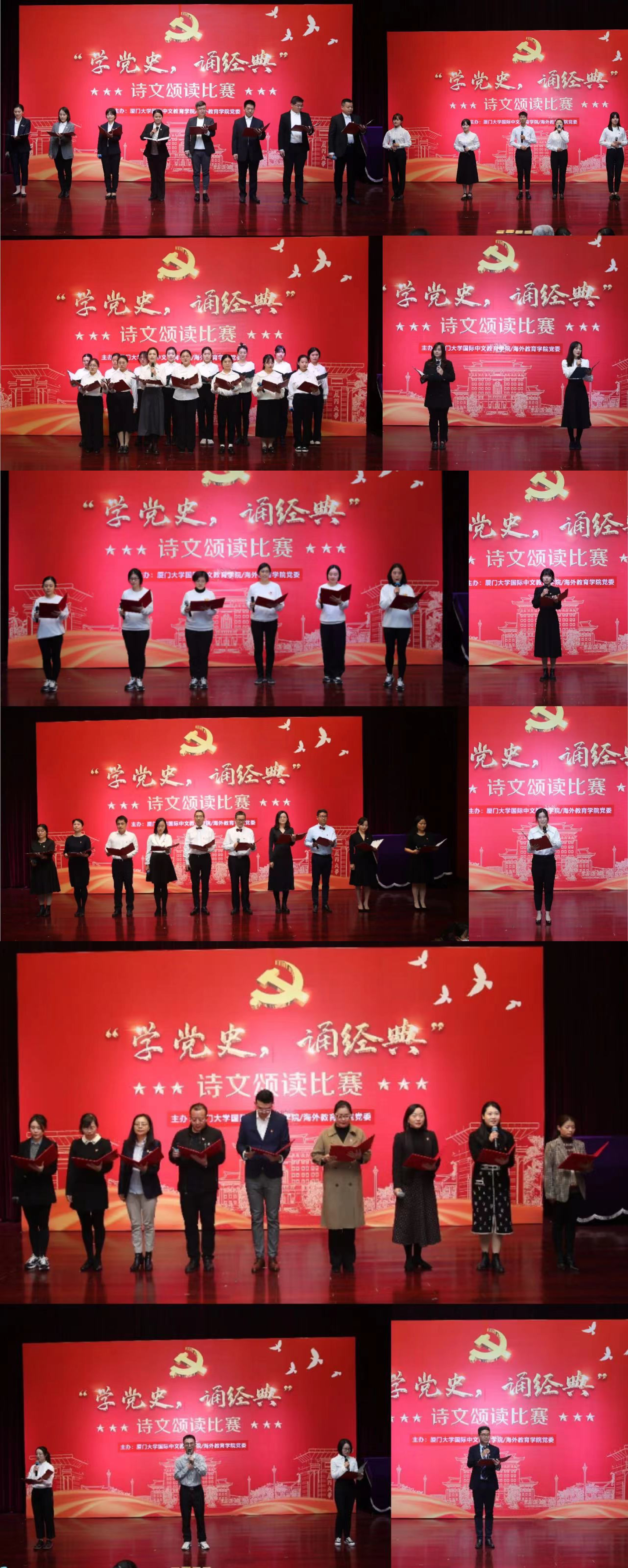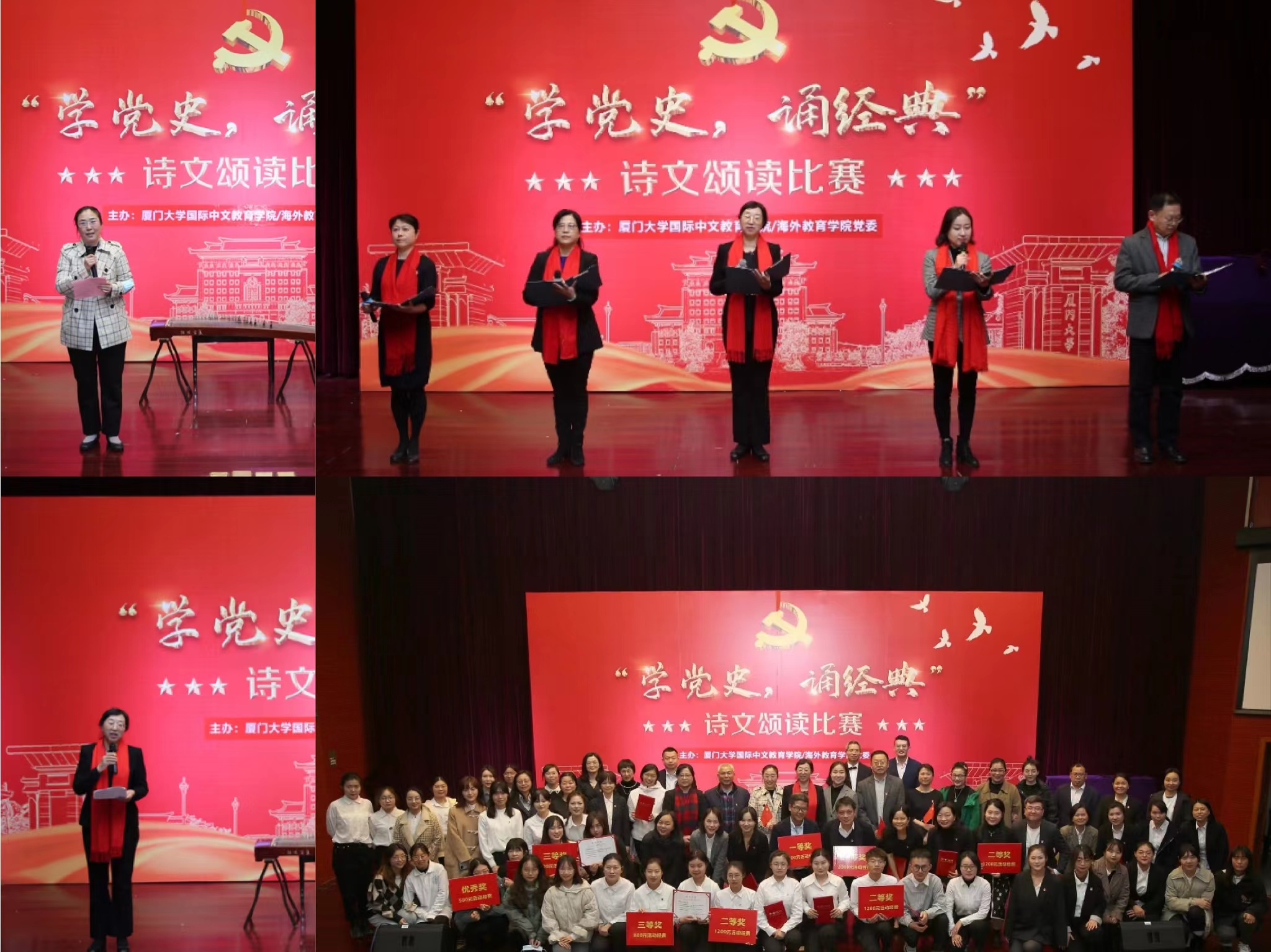 百载春秋竟漫长,红船指引铸辉煌。为扎实推进党史学习教育,重温党的光辉历程,歌颂党的伟大成就,赓续红色血脉,凝聚奋进力量。经过半个月的筹备,国际中文教育学院/海外教育学院“学党史,诵经典”诗文颂读比赛于2021年12月20日下午正式开赛。校党史学习教育第四指导组副组长、审计处林金宝副处长,校党委组织部副部长曲延云教授到场指导并担任评委,国际中文教育学院/海外教育学院党政班子全体成员以及学院全体师生参加了本次活动。