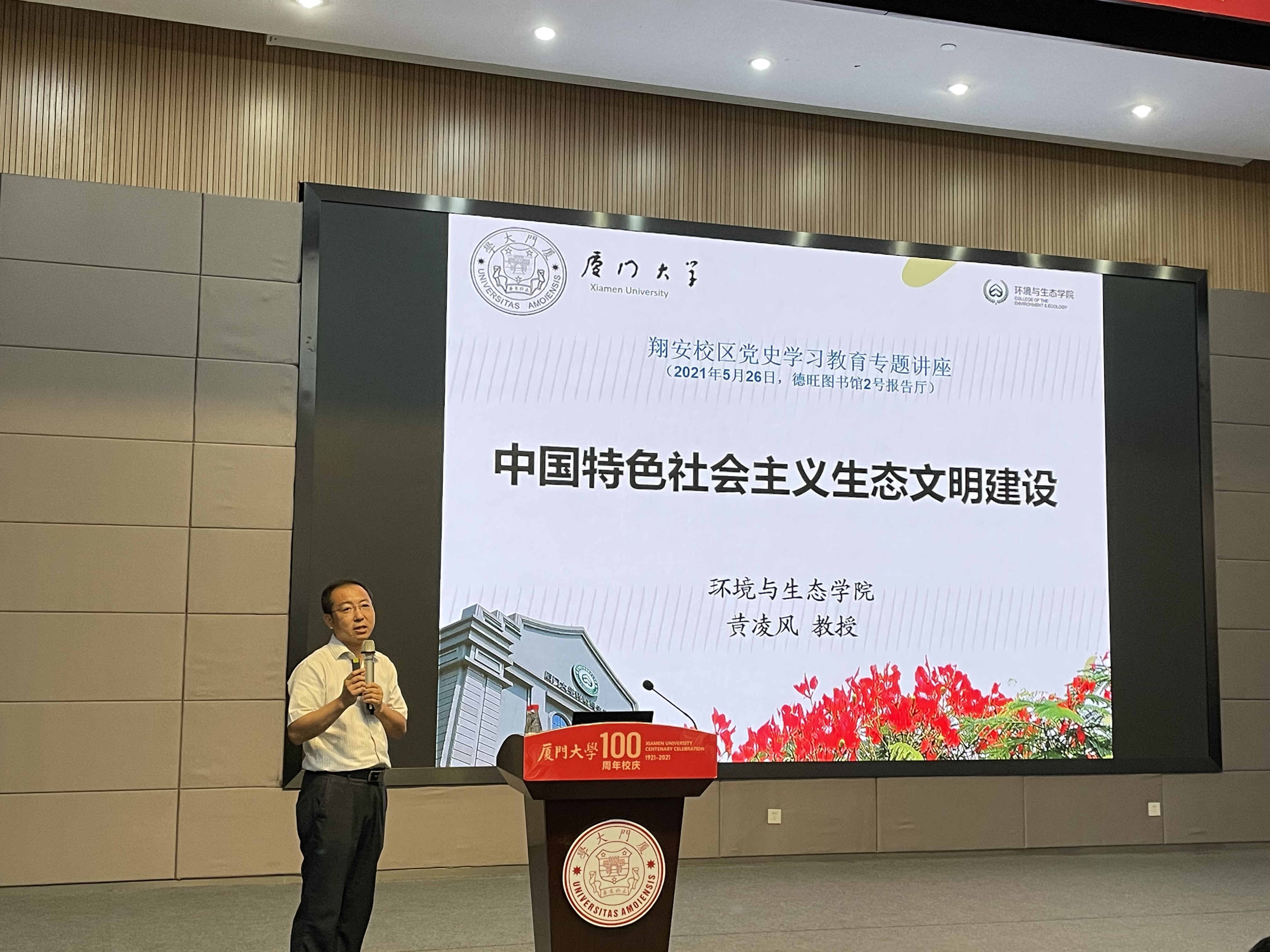 为扎实推进党史学习教育,筑牢思想根基,汲取奋进一流征程的智慧和力量,5月26日下午,翔安校区管委会、国际中文教育学院/海外教育学院联合举办党史学习教育专题讲座,邀请环境与生态学院黄凌风教授为校区管委会全体党员干部、校区各学院学工干部及国际中文教育学院/海外教育学院教职工作了题为《中国特色社会主义生态文明建设》的报告。