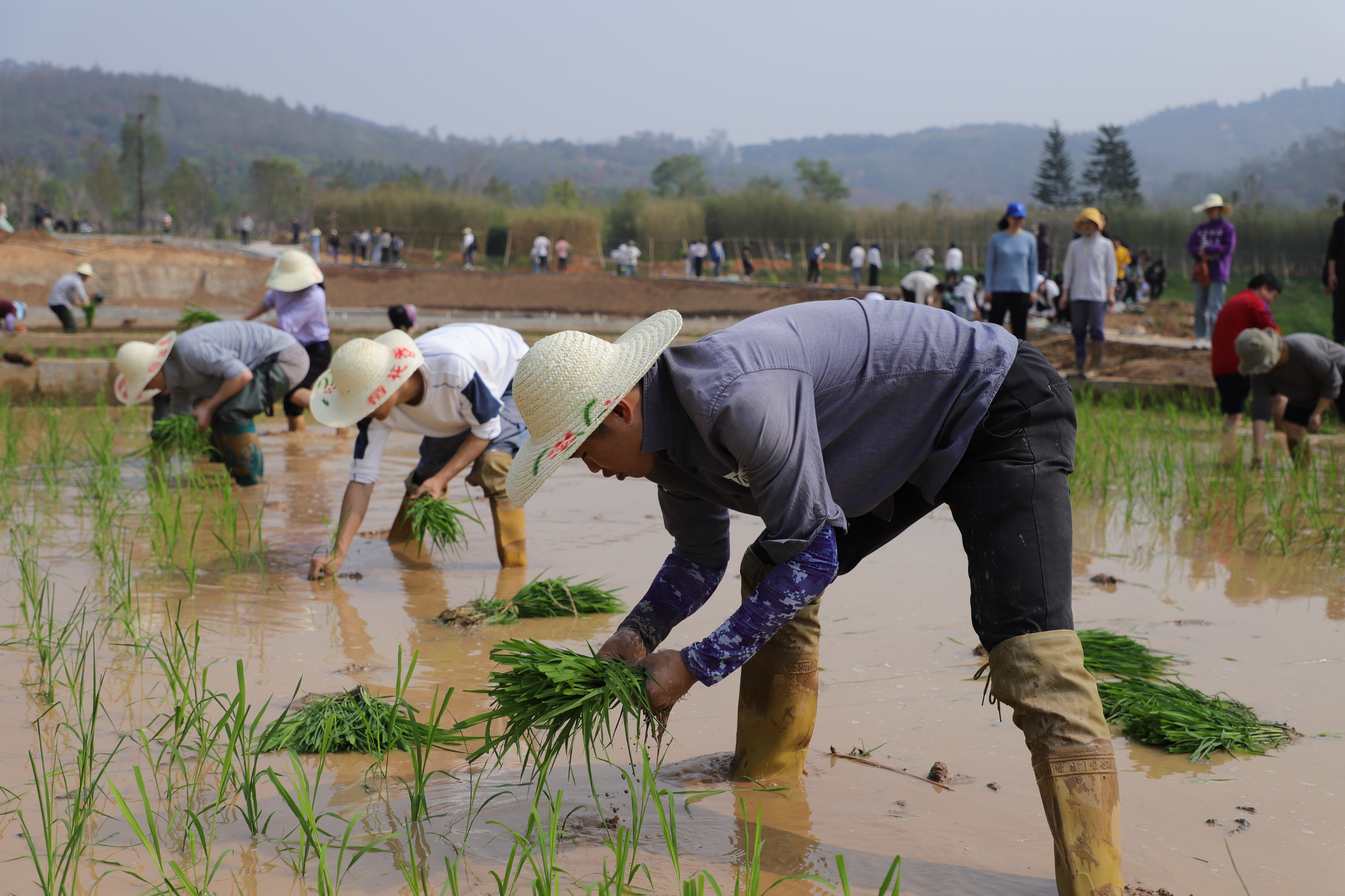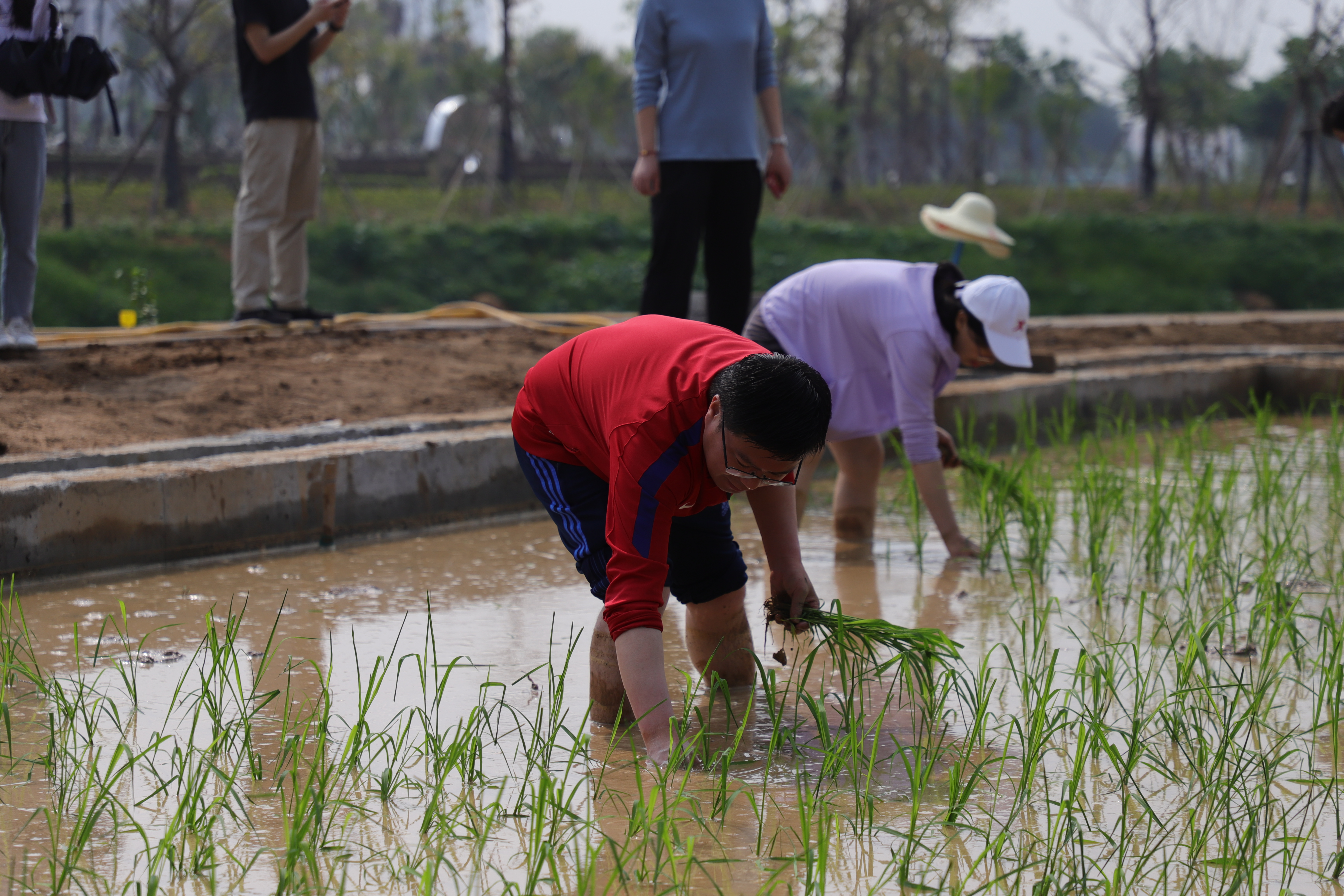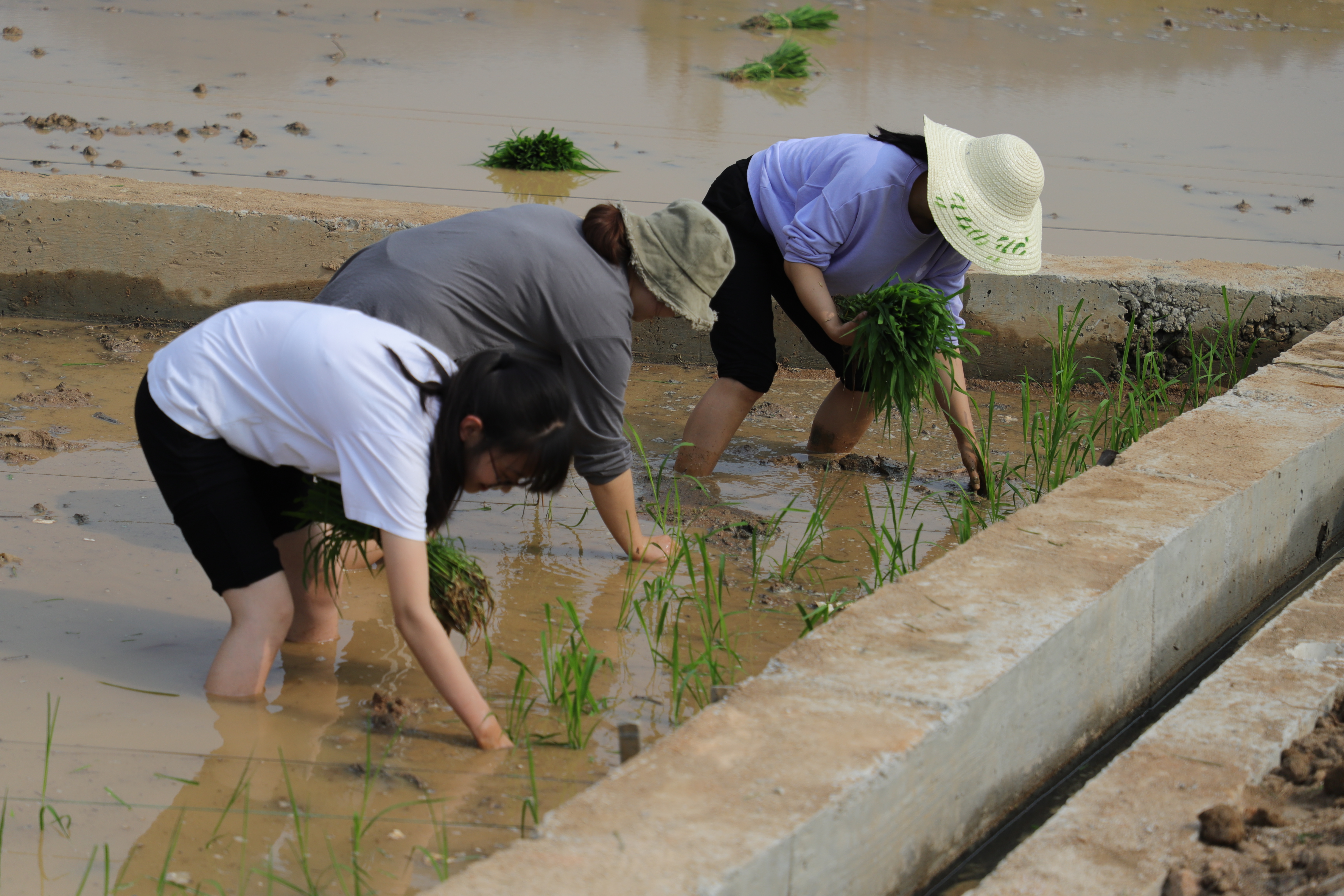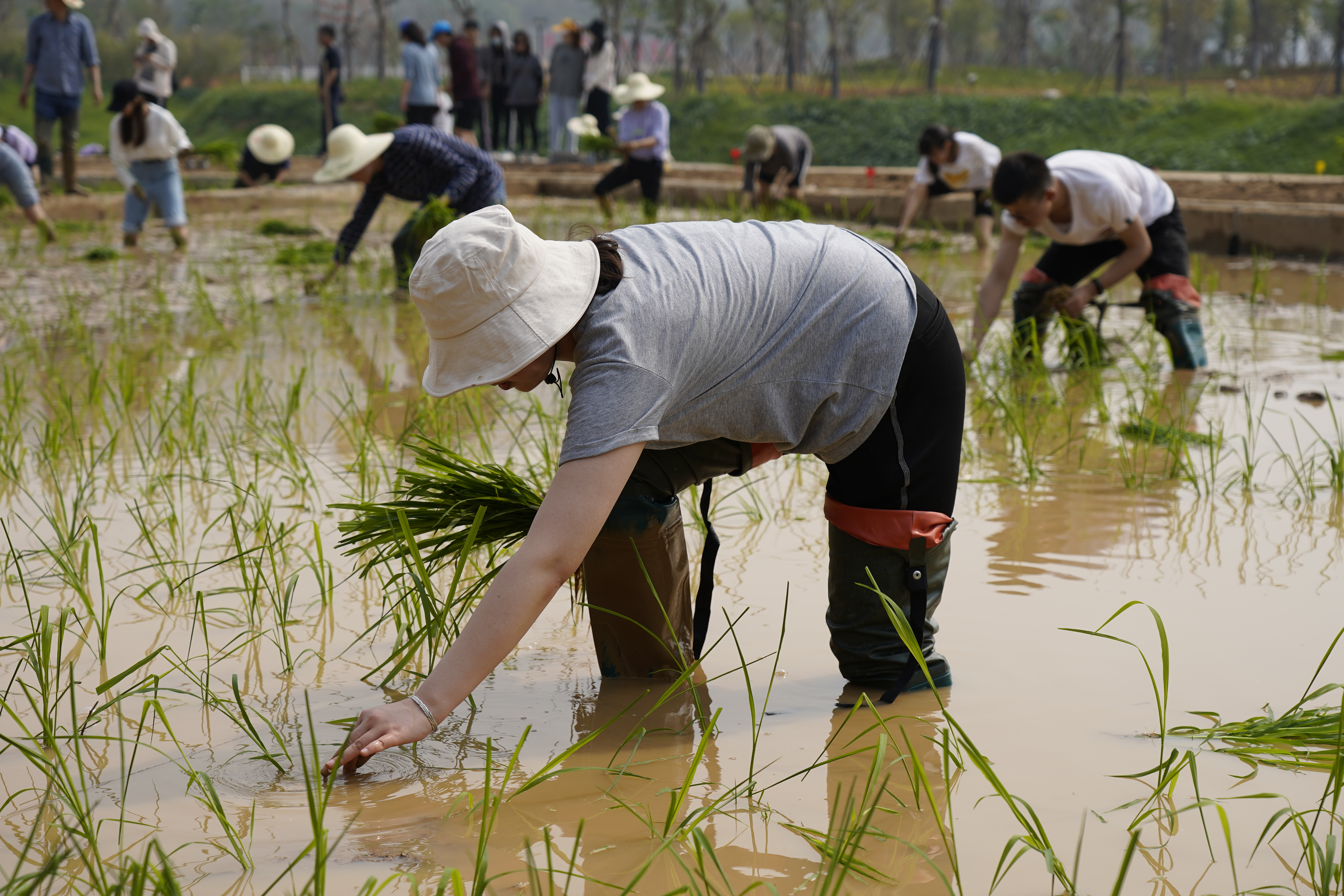 上午九时,师生齐聚 “八闽园”漳州小广场水稻栽培区。在老师的简要介绍与分工后,大家戴上草帽,蹬上胶靴,握起秧苗,各自认领一块“责任田”,认真投入到插秧中。占地数亩的水田很快充满了弯腰忙碌的身影。老师和同学们虽然身上都沾上泥浆,汗流浃背,可是都兴致勃勃。