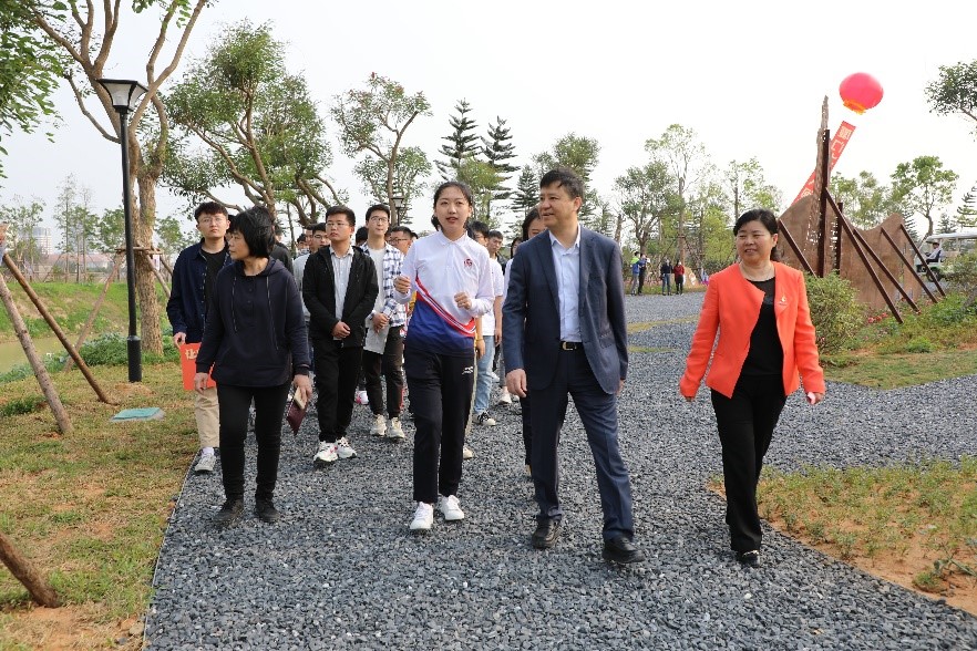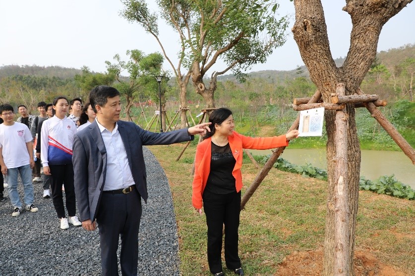 随后,在师生的陪同和礼仪的引导下,李建辉一行走进莆田园,详细了解莆田园的规划和建设情况。莆田园的文化墙上方以蜿蜒的曲线还原了莆田的地貌,最左边是莆田仙游的菜溪岩,中间的是海内外闻名的妈祖,最右边的是莆田南山广化寺大雄宝殿,文化墙前面以红木来反映莆田发达的木材产业,红木旁边蜿蜒的草坪代表莆田的母亲河木兰溪。文化墙区域以栩栩如生的雕刻,内涵深刻的象征,呈现出莆田的名景,突出了莆田的特色。文化墙后方分布的是海桐,以及莆田的月季,春风和煦,繁花似锦,仿佛置身于仲春四月的莆田。