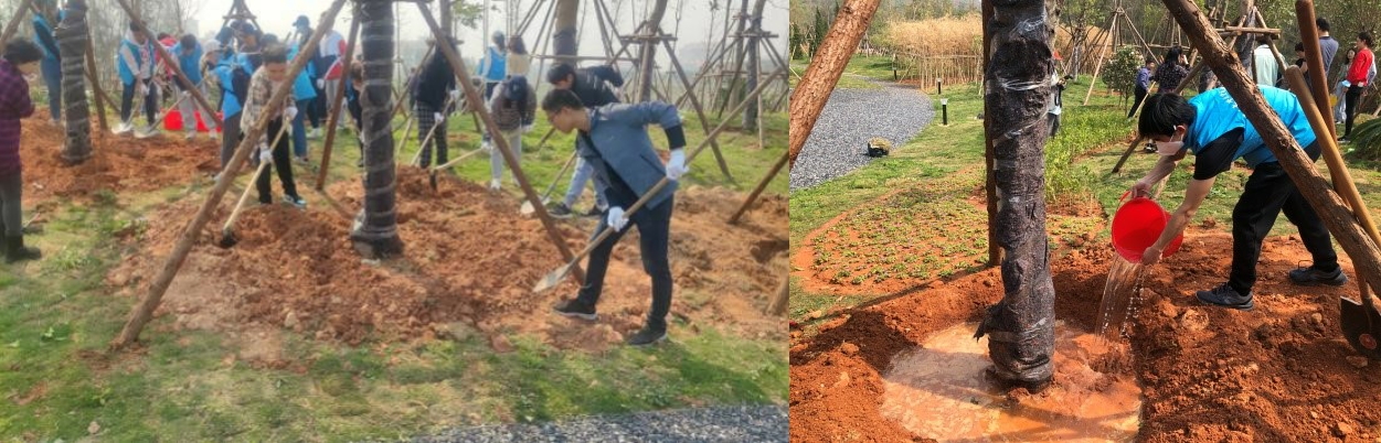 植树现场,老师、同学们三五成群,分工协作,干劲十足,锹镐上下挥舞,填土、夯实、取水、灌溉,认真细致,有条不紊地完成每一项工作,植树现场呈现出一片热火朝天的劳动场面。在师生们的共同努力下,一棵棵树苗稳稳得植根八闽大地。