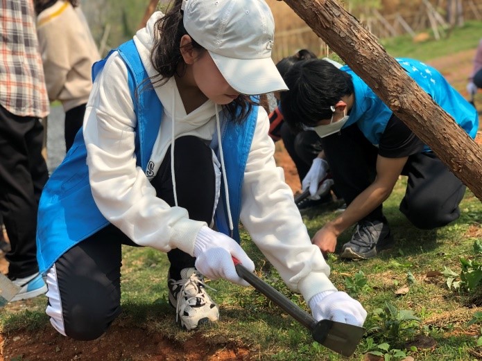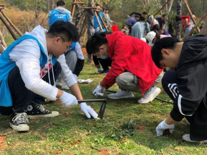 植树活动结束,为了更好地建设林场环境,师生代表相继承包了园区的绿化工作,同学们积极清除林木周围草坪上的杂草,八闽园顿时焕然一新。