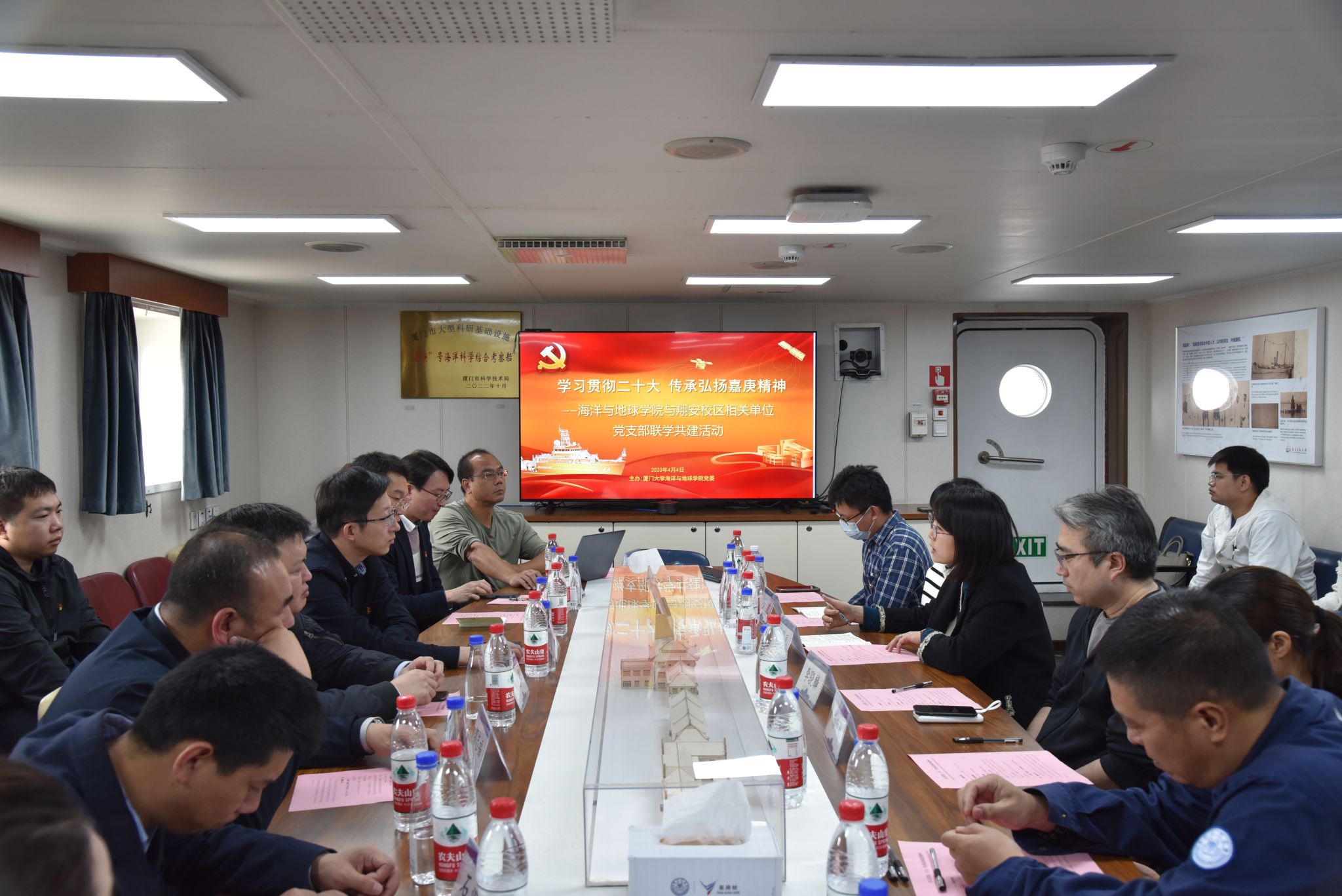 为深入学习贯彻党的二十大精神,在厦门大学建校102周年之际,4月4日上午,海洋与地球学院联合翔安校区相关单位党支部在 “嘉庚”号海洋科考船开展 “学习贯彻党的二十大 传承弘扬嘉庚精神”联学共建活动。翔安校区保卫办主任陶元升、学生办主任高斌、实验办主任郭志福、海洋与地球学院党委副书记邱荣锋、唐腾凤、副院长李骁麟,以及来自翔安校区办公室党支部、学生工作部(处)第三党支部、翔安校区保卫办公室党支部、翔安校区实验办、现代教育技术与实践训练办公室、图书馆和海洋与地球学院的党员干部共计50余人参加了活动。